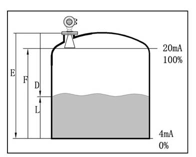 通過輸入空罐高度E(=零點(diǎn)),滿罐高度F(=滿量程)及一些應(yīng)用參數(shù)來設(shè)定,應(yīng)用參數(shù)將自動使儀表適應(yīng)測量環(huán)境。對應(yīng)于4-20mA輸出。
