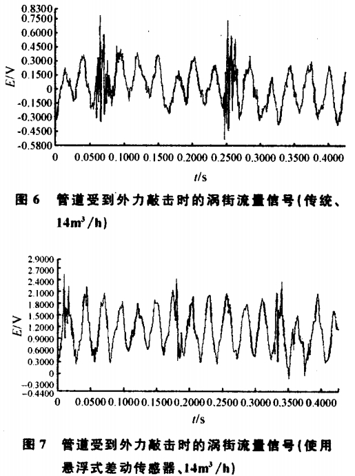 圖6與圖7分別為傳統(tǒng)渦街流量計(jì)與使用了懸浮式差動(dòng)傳感器的渦街流量計(jì)在管道受到外力敲擊時(shí)的渦街流量信號(hào)(該信號(hào)為經(jīng)差動(dòng)放大后的信號(hào)).由圖6可見,傳統(tǒng)渦街流量計(jì)對(duì)振動(dòng)非常敏感,渦街流量信號(hào)中疊加了很強(qiáng)的干擾信號(hào).而在使用了懸浮式差動(dòng)傳感器的渦街流量計(jì)中,管道受到敲擊時(shí)的干擾被大大削弱,在經(jīng)差動(dòng)放大后幾乎沒有干擾信號(hào).