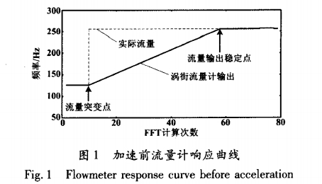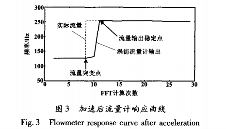 圖3為經(jīng)過(guò)加速處理后40口徑渦街流量計(jì)在流量突變時(shí)的響應(yīng)曲線。可見,在流量突變后,系統(tǒng)經(jīng)過(guò)3次FFT計(jì)算就能跟上流量的變化,有效地提高了流量計(jì)的響應(yīng)速度。