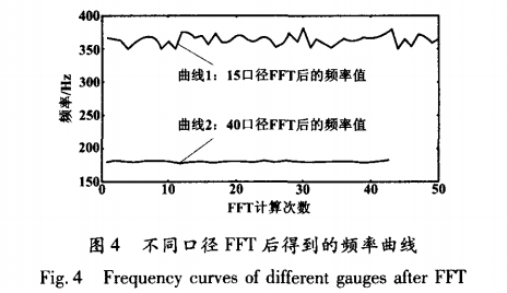 在小流量的時(shí)候渦街流量計(jì)信號(hào)微弱,信噪比降低,信號(hào)質(zhì)量比較差,頻譜分析得到的渦街頻率波動(dòng)比較大。特別是小口徑渦街流量計(jì),由于傳感器安裝等原因,這種現(xiàn)象更為明顯。圖4中,曲線1為15口徑渦街流量計(jì)在下限頻率附近,每次FFT計(jì)算得到的渦街頻率;曲線2為40口徑離下限頻率比較遠(yuǎn)時(shí)每次FFT計(jì)算后得到的渦街頻率?梢姡1波動(dòng)較大,數(shù)值約為30Hz。此時(shí),即便采取平均措施,也無(wú)法使輸出頻率值穩(wěn)定。