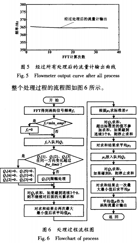 流量計(jì)斷續(xù)問(wèn)題主要是由于偶爾幾次的FFT計(jì)算幅值低于最小截止幅值所致。通過(guò)實(shí)驗(yàn)發(fā)現(xiàn),在流量計(jì)可測(cè)流量范圍內(nèi)-般不會(huì)出現(xiàn)連續(xù)幾次FFT計(jì)算幅值均小于最小截止幅值的情況,所以在碰到FFT計(jì)算幅值低于最小截止幅值時(shí)不是直接輸出0,而是將0放入隊(duì)列Q1。在計(jì)算平均頻率以前先對(duì)隊(duì)列Q1中最近的N(N可取3~4)個(gè)值進(jìn)行判斷,如果N個(gè)值,全部為0,則流量計(jì)輸出為0,否則繼續(xù)做平均計(jì)算,將平均值作為流量計(jì)的輸出頻率,這樣就可以解決輸出斷續(xù)的問(wèn)題。